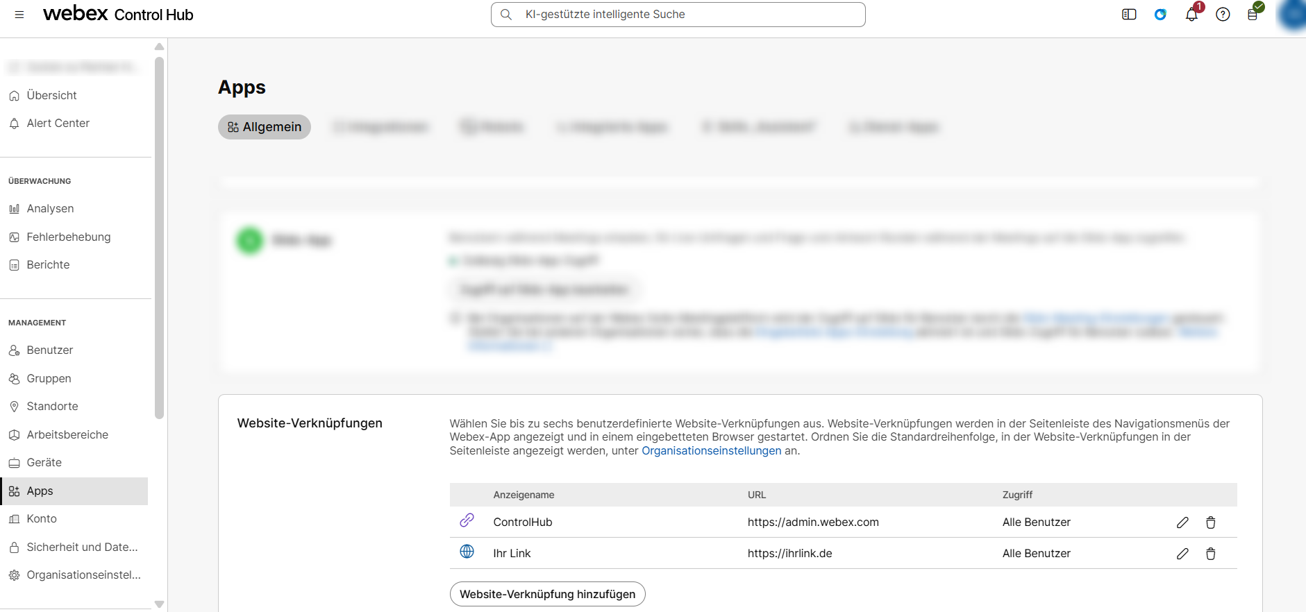Sie können die Verlinkung zum Webex AppHub entfernen, so dass die User nicht mehr auf Ihn zugreifen können. Die Einstellungen für diese Funktion finden Sie unter Apps → Allgemein → Webex AppHub